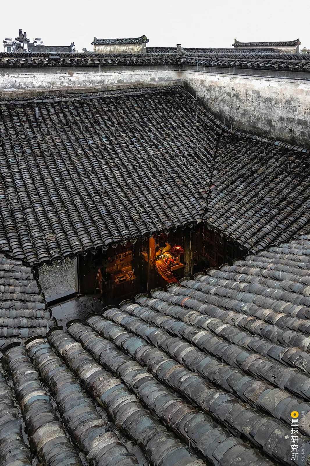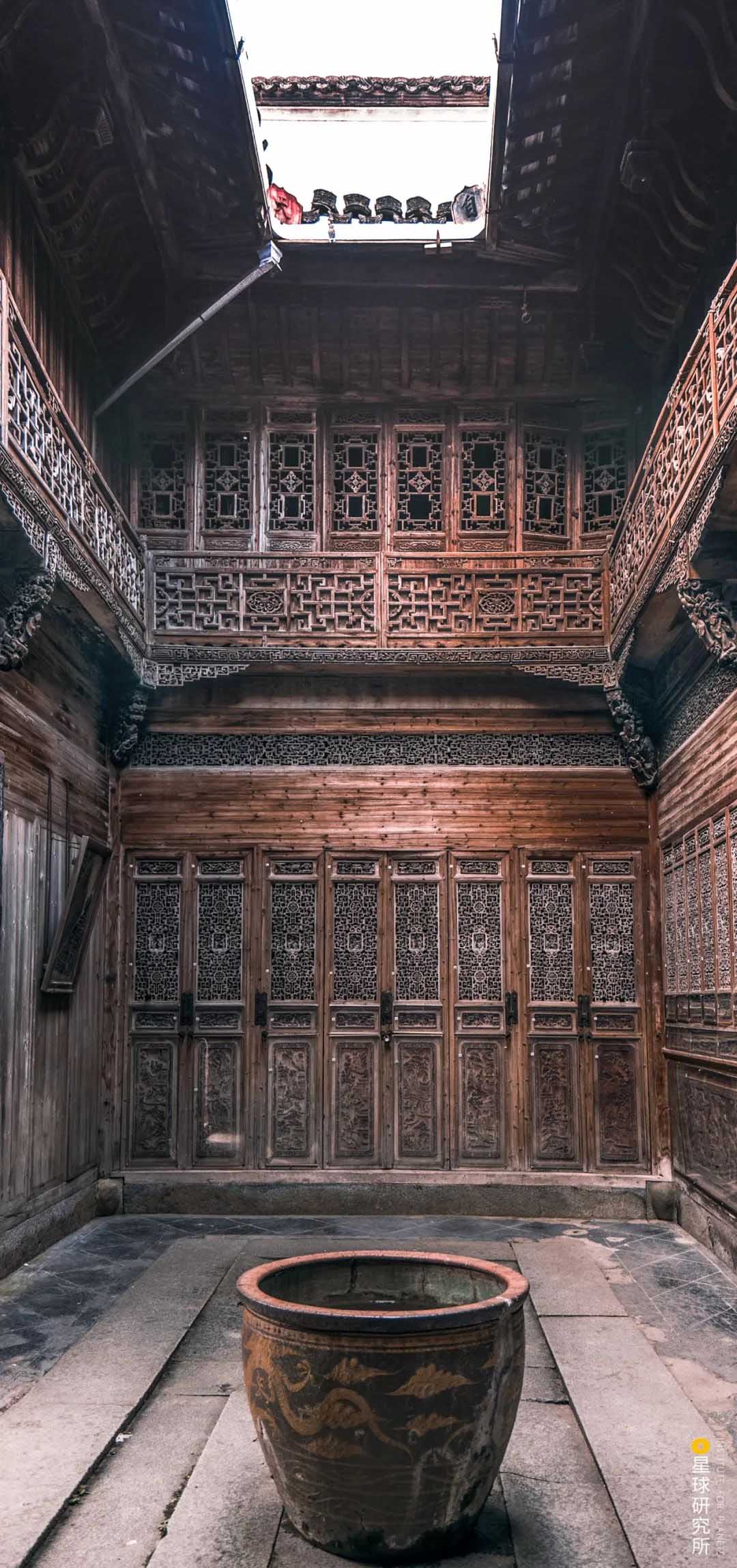 在雨天,雨水順著四周傾斜的屋頂,匯入天井,是為“四水歸堂”,寓意“肥水不流外人田”,不知從前是否有佳人,倚著美人靠,靜默聽(tīng)雨。