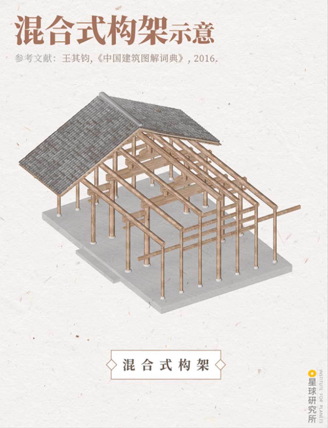 (穿斗式與抬梁式對(duì)比示意,檁條直接放置在柱子上,再用穿枋和斗枋連接為一個(gè)整體,是為穿斗式;柱上放梁,梁上架檁,柱子將梁層層抬起,是為抬梁式,制圖@王申雯/星球研究所)