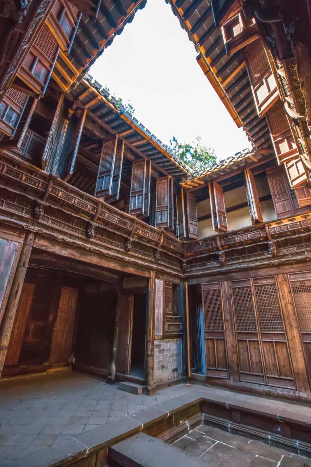 而臥室、廳堂等空間,又因襲四合院的布局,在建筑之中圍合出一方院落,干欄式建筑的“樓居”形式,讓其在視覺(jué)比例上,顯得幽深窄小,人們形象地稱之為:“天井”。