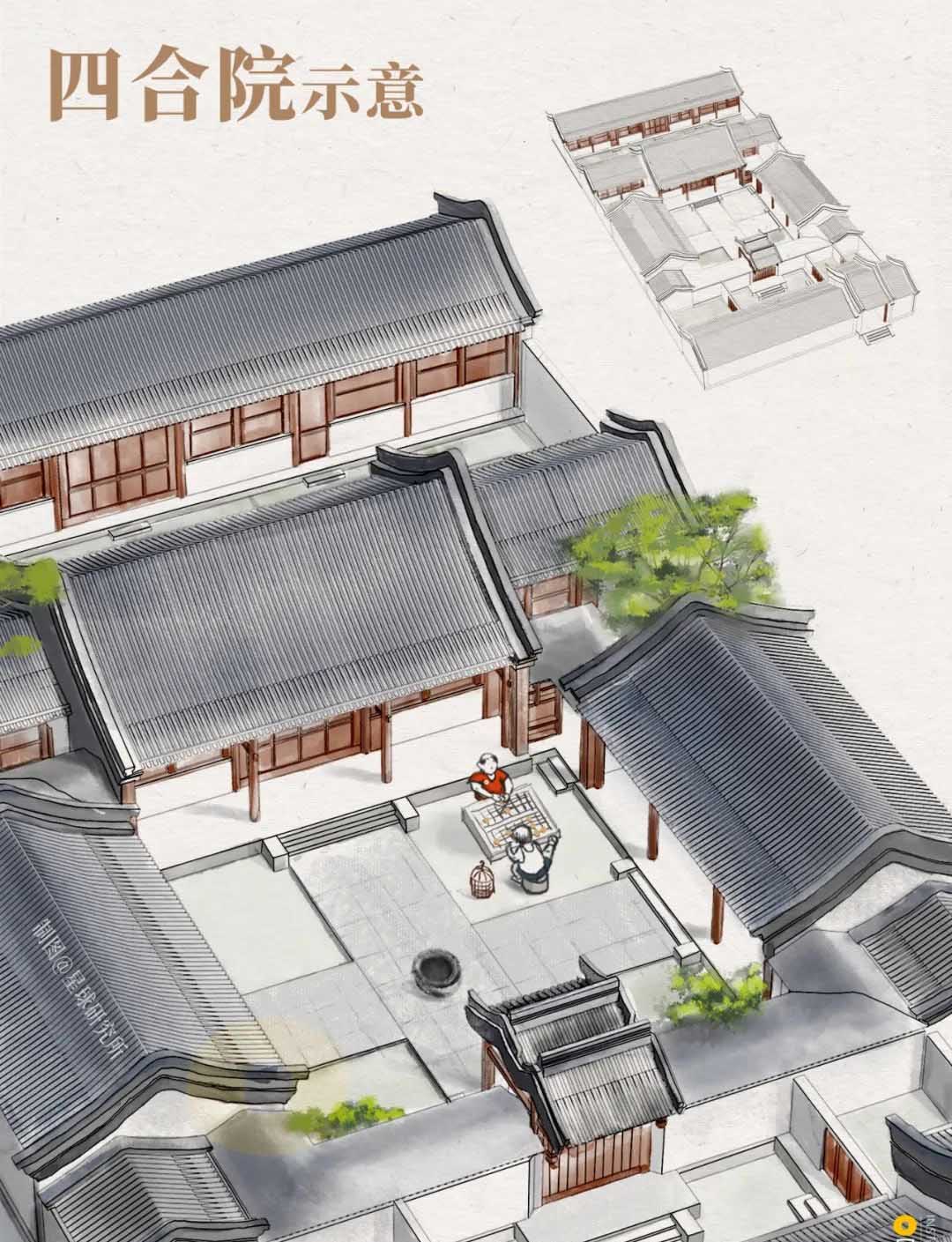 其次,是附著于結(jié)構(gòu)之上的,建筑形式的融合,移民們參照當(dāng)?shù)兀蓹谑浇ㄖ摹皹蔷印毙问?,將原本平鋪在地面上的,四合院建筑抬升?-3層,一般來(lái)說(shuō),一層中間布置廳堂。